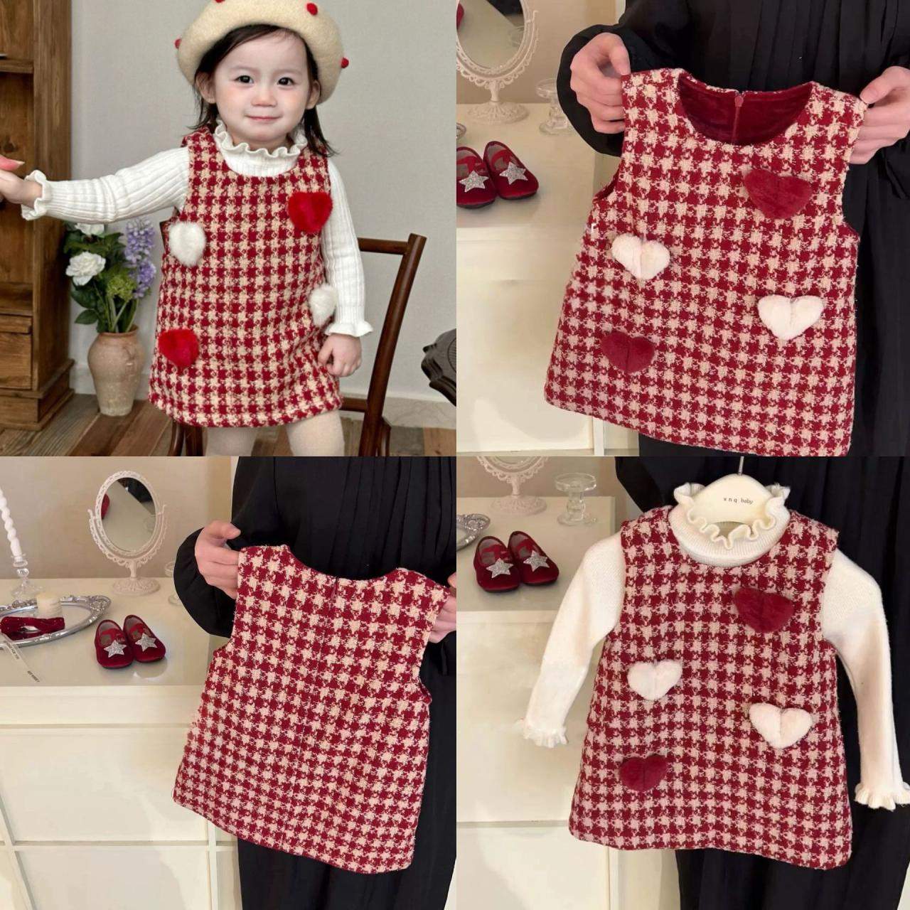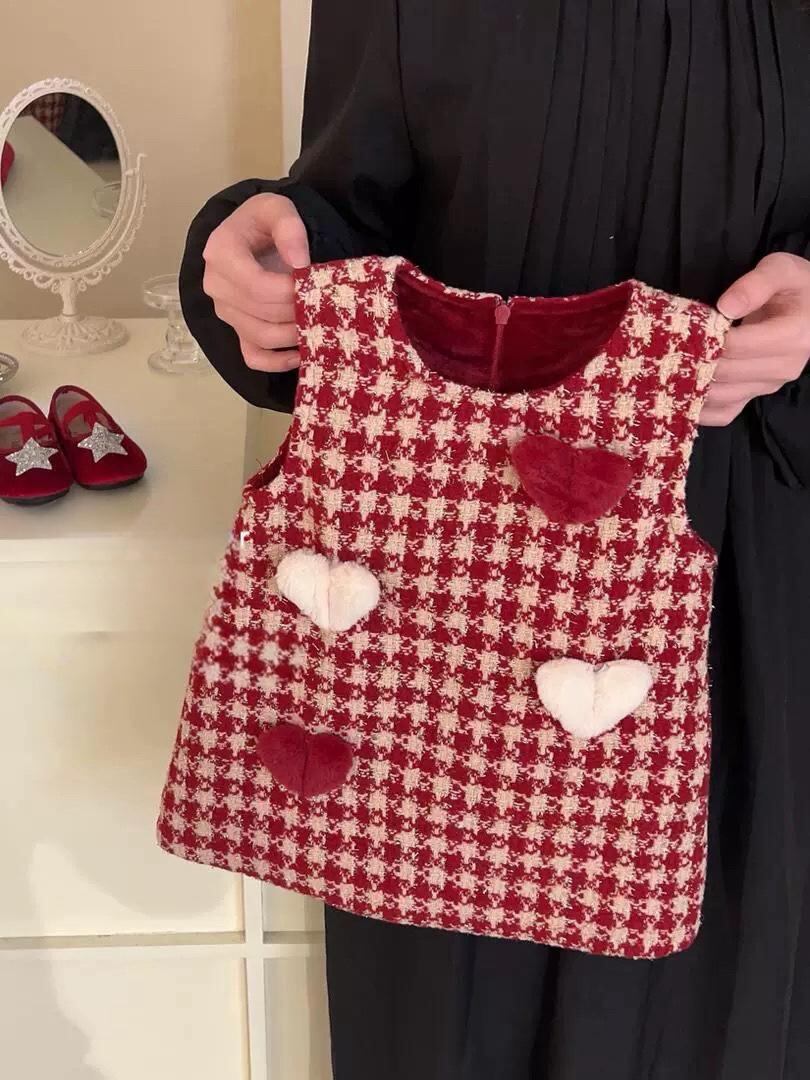 ワンピース 女の子 子供 千鳥格子 ハート柄 フォーマル ドレス チュールスカート ベスト付き 発表会 結婚式 レッド 春秋 冬 80 90 100 110 120 130 140 150