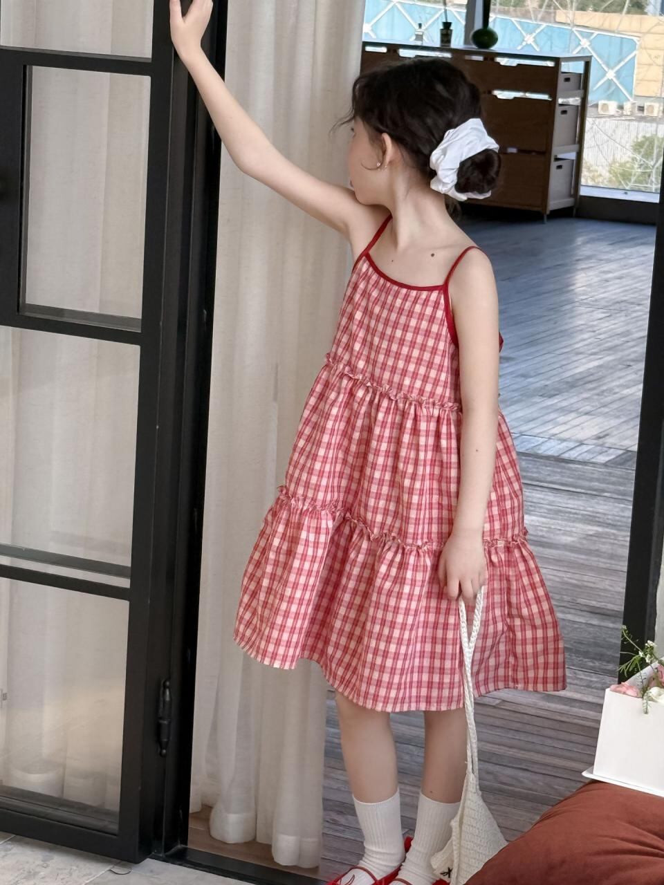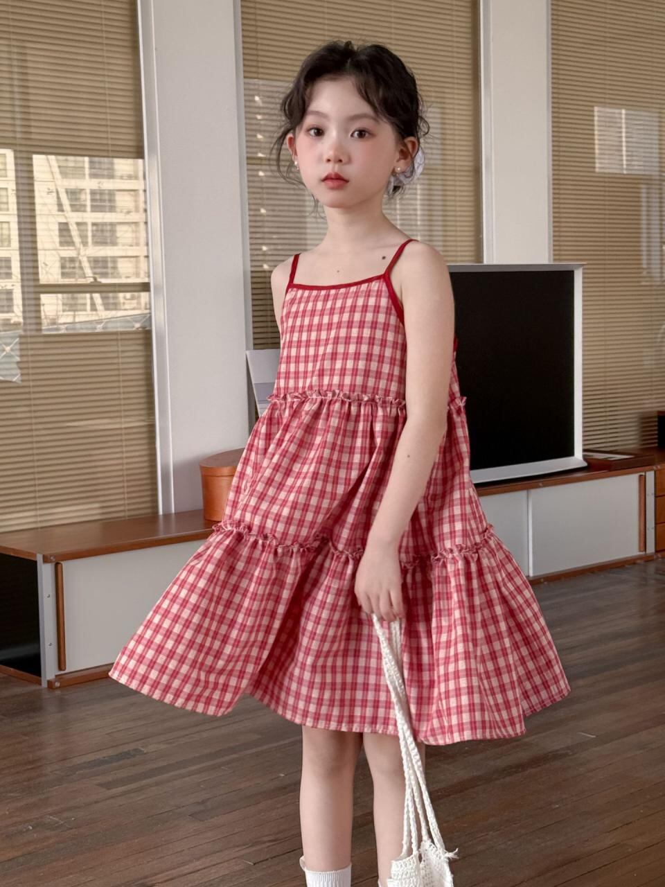 ワンピース 女の子 子供 レッド チェック柄 キャミソールワンピース サマー ドレス スウィート かわいい キッズ ウェア リゾート スタイル プリンセス スカート 綿