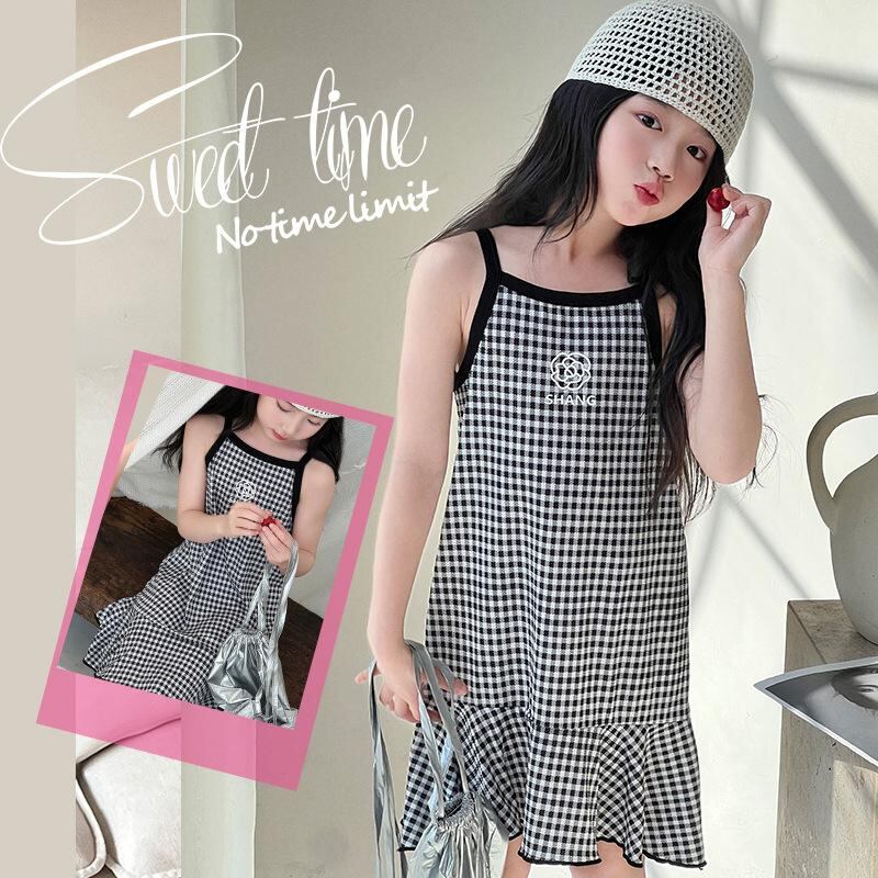 ワンピース 女の子 夏 格子柄 小香風 吊りスカート かわいい 魚尾 プリンセス 涼しい ポリエステル