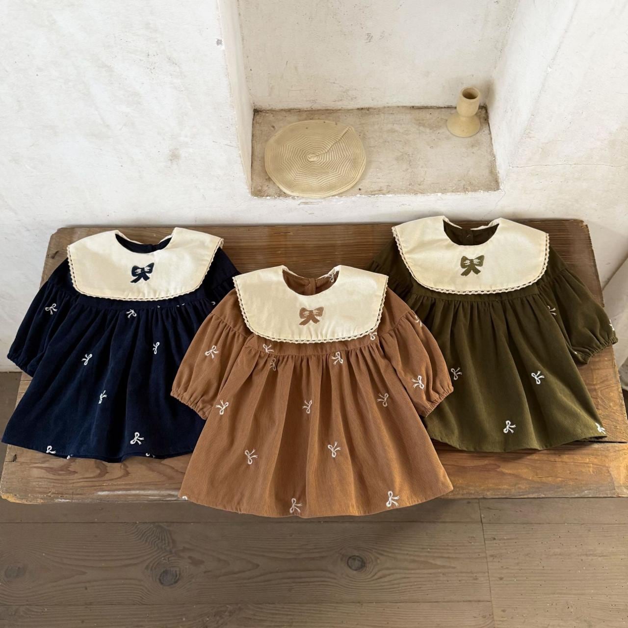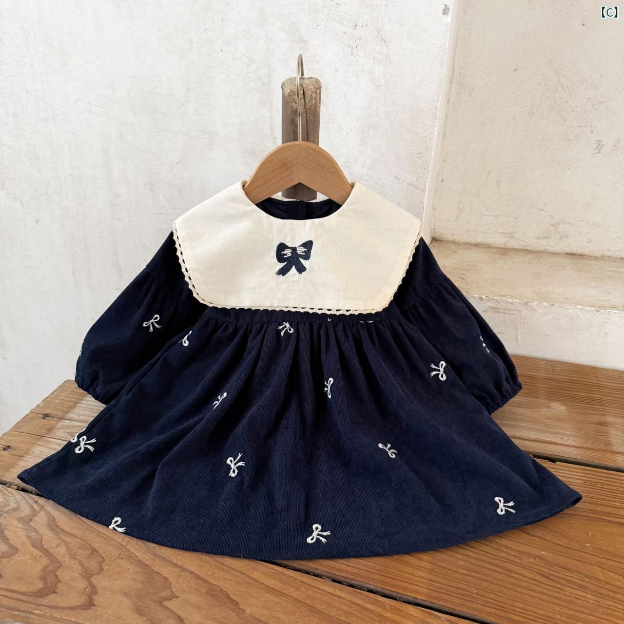 ワンピース キッズ コーデュロイ 花柄 フリル 蝶結び 刺繍 襟付き カジュアル 春秋 冬 73CM 80cm 90cm 100cm 110cm 120cm カーキ グリーン 紺