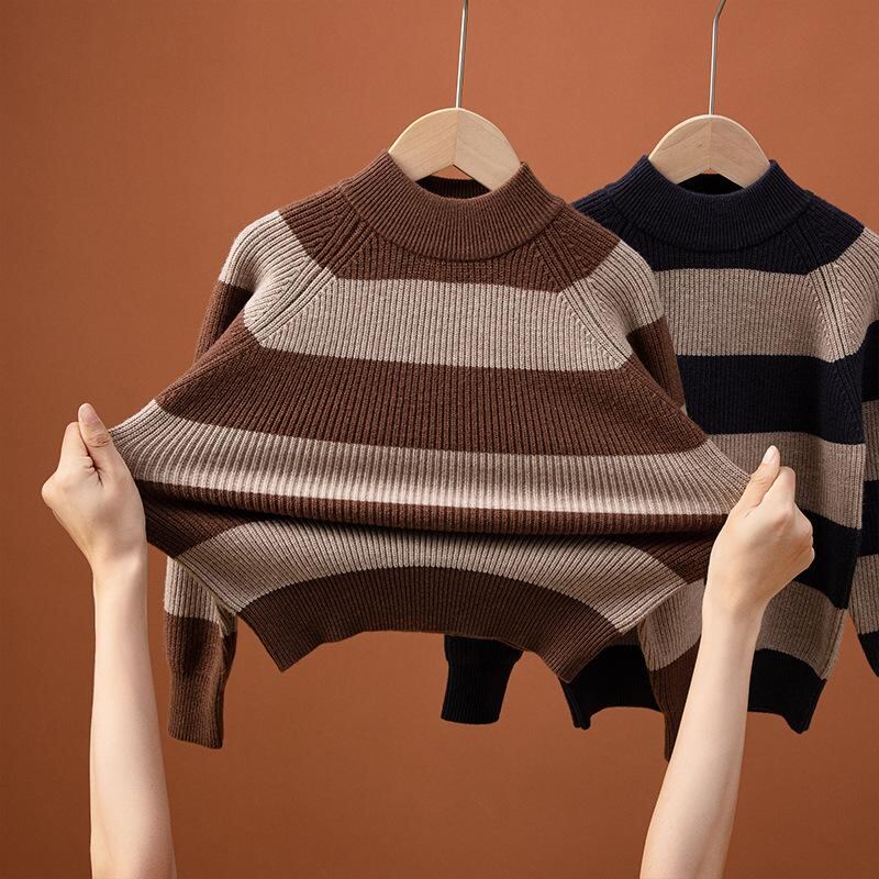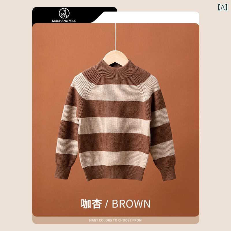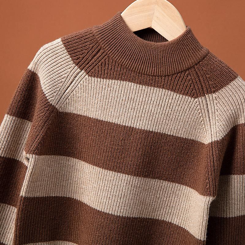 result: specifications: ・対象性別: 男女兼用 ・生地の加工: 柔らかい ・スタイル: シンプル ・対象年齢: 中小(3~8歳、100~140cm) ・おすすめ季節: 冬、秋 ・糸の太さ: 太い ・厚さ: 普通 ・袖丈: 長袖 ・留め具の種類: プルオーバー ・柄: ストライプ ・実物写真: モデルなし ・在庫: あり ・要素: 配色 ・生地の名称: ウール混紡 ・主な生地の組成: ウール ・主な生地の組成含有量: 7.5% ・安全レベル: A ・襟の形: ラウンドネック ・フード: なし ・色: 杏色とコーヒー色、杏色と青色 ・おすすめ身長: 90cm、100cm、110cm、120cm、130cm、140cm、150cm ・前立て: プルオーバー ・襟ネーム: あり ・製品カテゴリ: 子供用セーター ・供給タイプ: メーカーダイレクト ・下げ札: あり