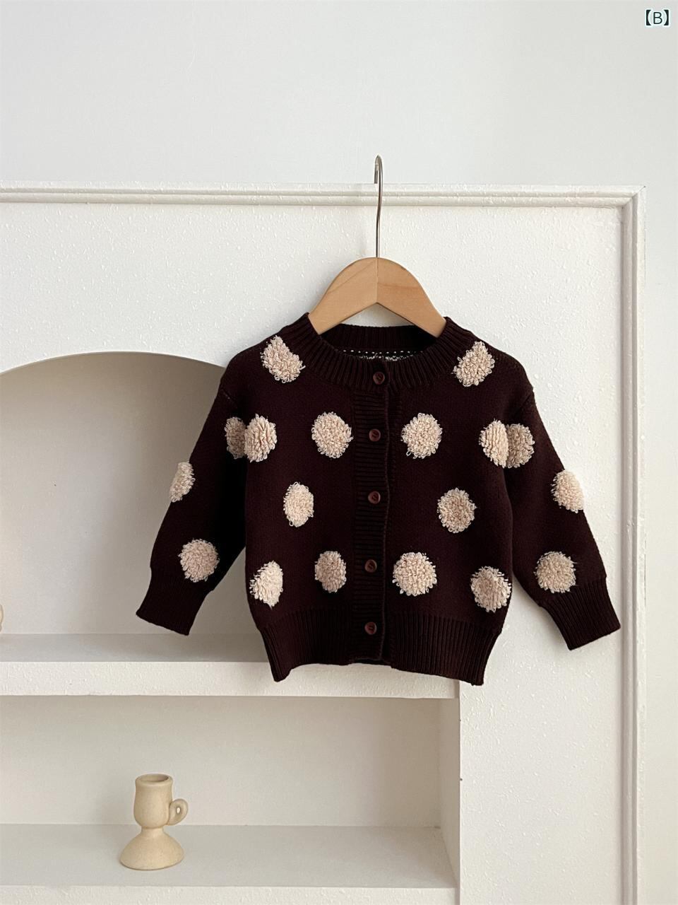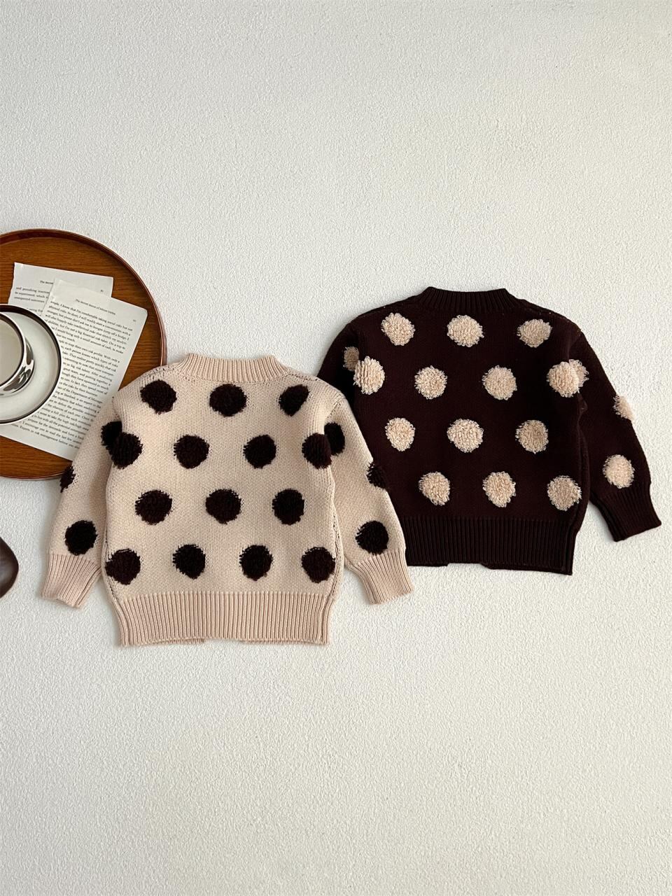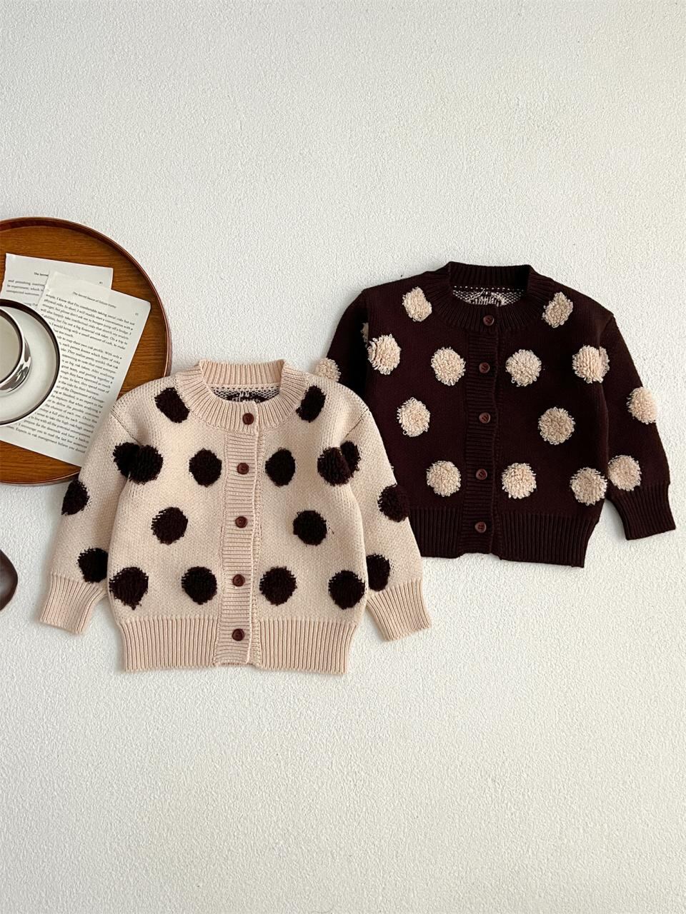 ベビー服 ニットカーディガン 春秋 男女兼用 長袖 コットン100% 丸首 前開き ドット柄 厚手 柔らかい 赤ちゃん 乳幼児 幼児 子供服 66cm 73cm 80cm 90cm 100cm 杏色 コーヒー色