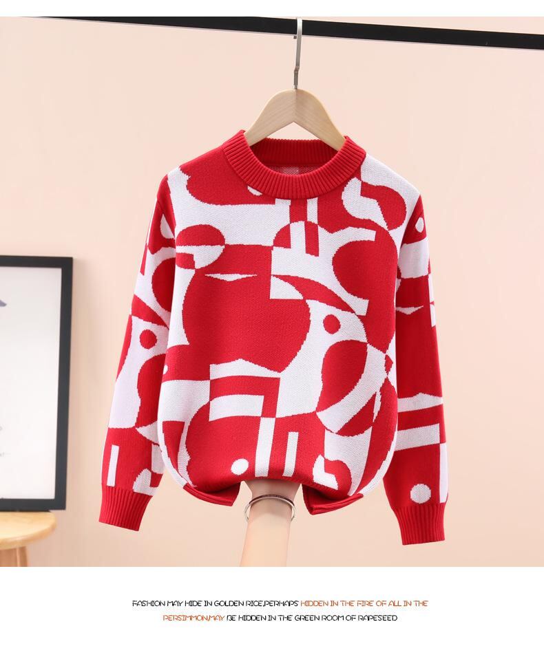 ニット・セーター ガールズ 子供服 秋冬 綿100% ジャカード編み 厚手 ラウンドネック 長袖 トップス 通学 普段使い かわいい ピンク系 レッド系