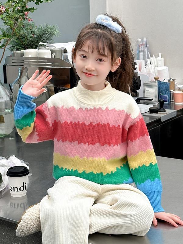 ニット・セーター ガールズ 子供服 冬服 裏起毛 ニット カラフル 虹色 暖かい 長袖 トップス 普段使い かわいい