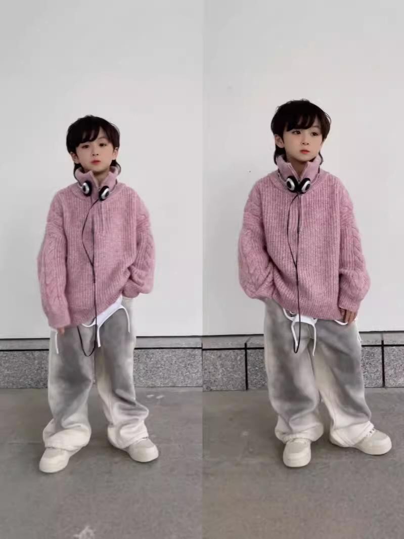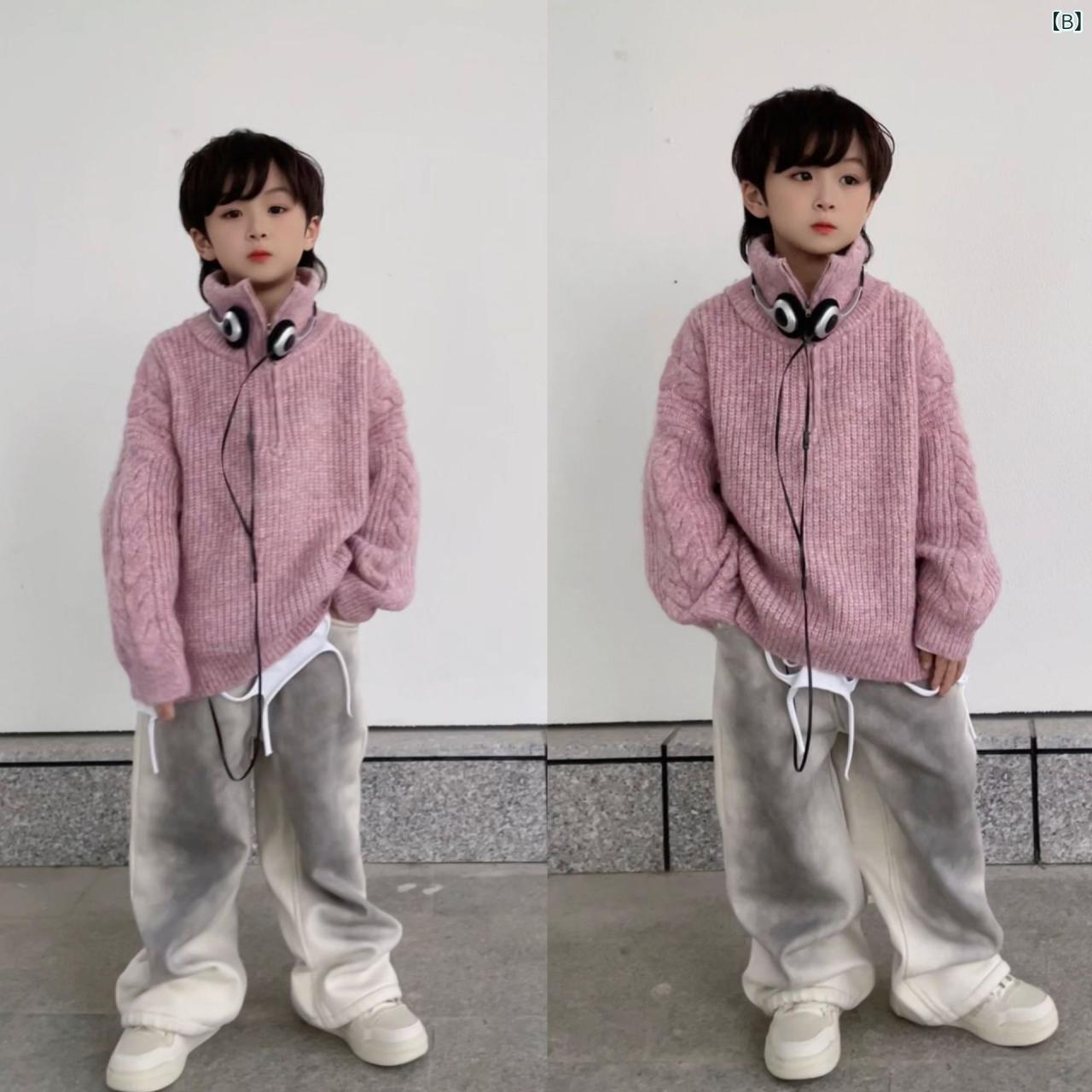 ニット キッズ 子供 男の子 女の子 ジップアップ セーター 厚手 秋冬 韓国風 粗毛糸 綿 アクリル 無地 グレー ピンク系