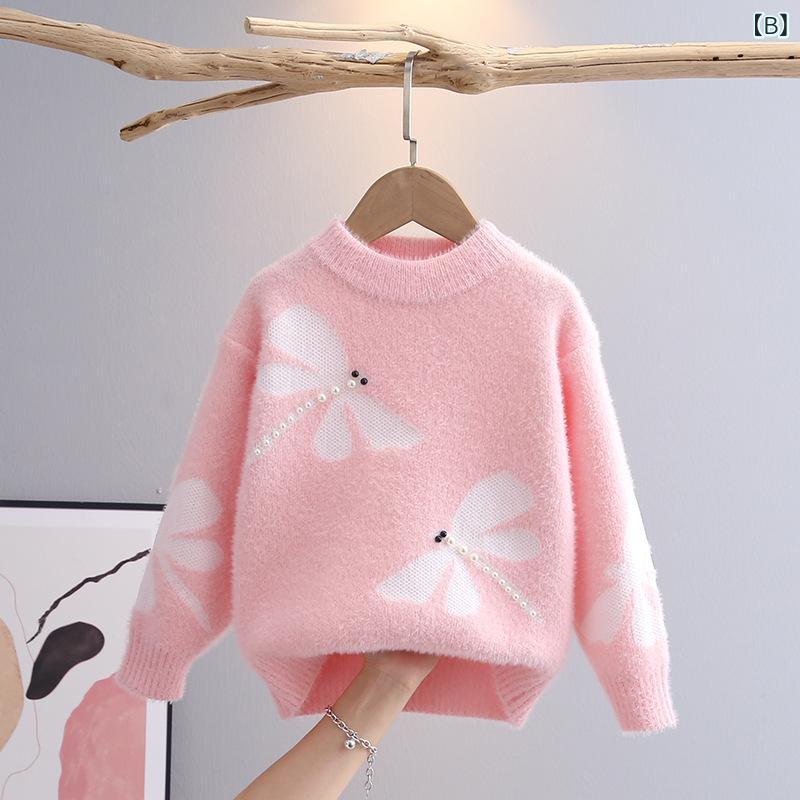 子供服 ニット/セーター 女の子用 秋冬 ニットトップス 長袖 丸首 プルオーバー 普段着 保温性 柔らかい ポリエステル カワイイ ピンク系 ホワイト