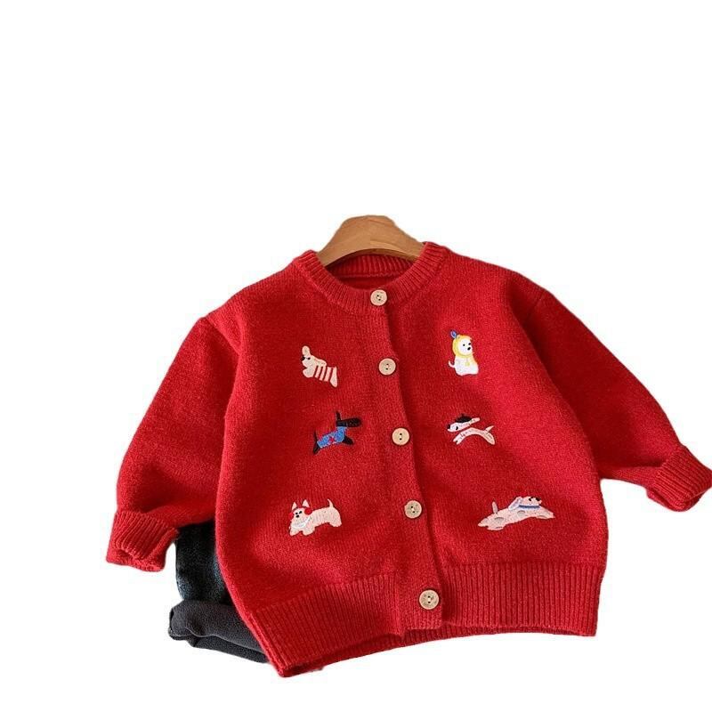 子供服 ニット カーディガン 秋冬 男女兼用 刺繍 小犬 コットン 長袖 トップス 90 100 110 120 130 140 レッド