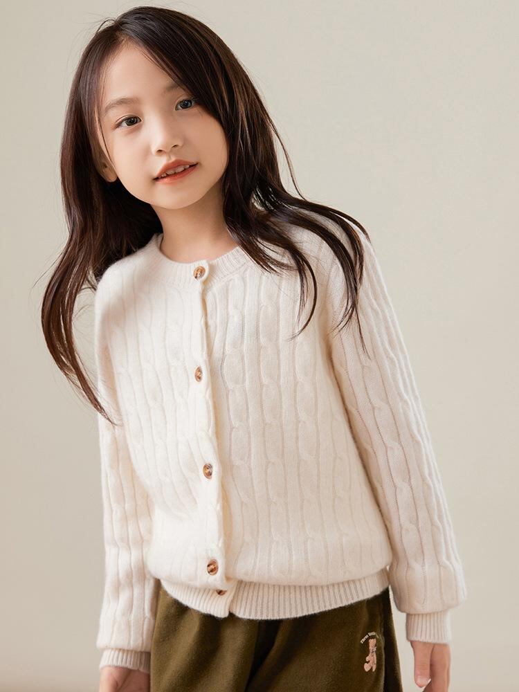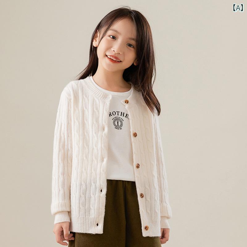子供服 ニット 100% ウール セーター 丸首 長袖 カーディガン 厚手 秋冬 男の子 女の子 中学生 小学生 通学 普段使い かわいい おしゃれ 白 グレー ブルー キャメル
