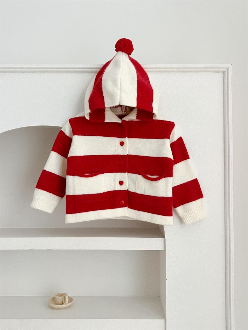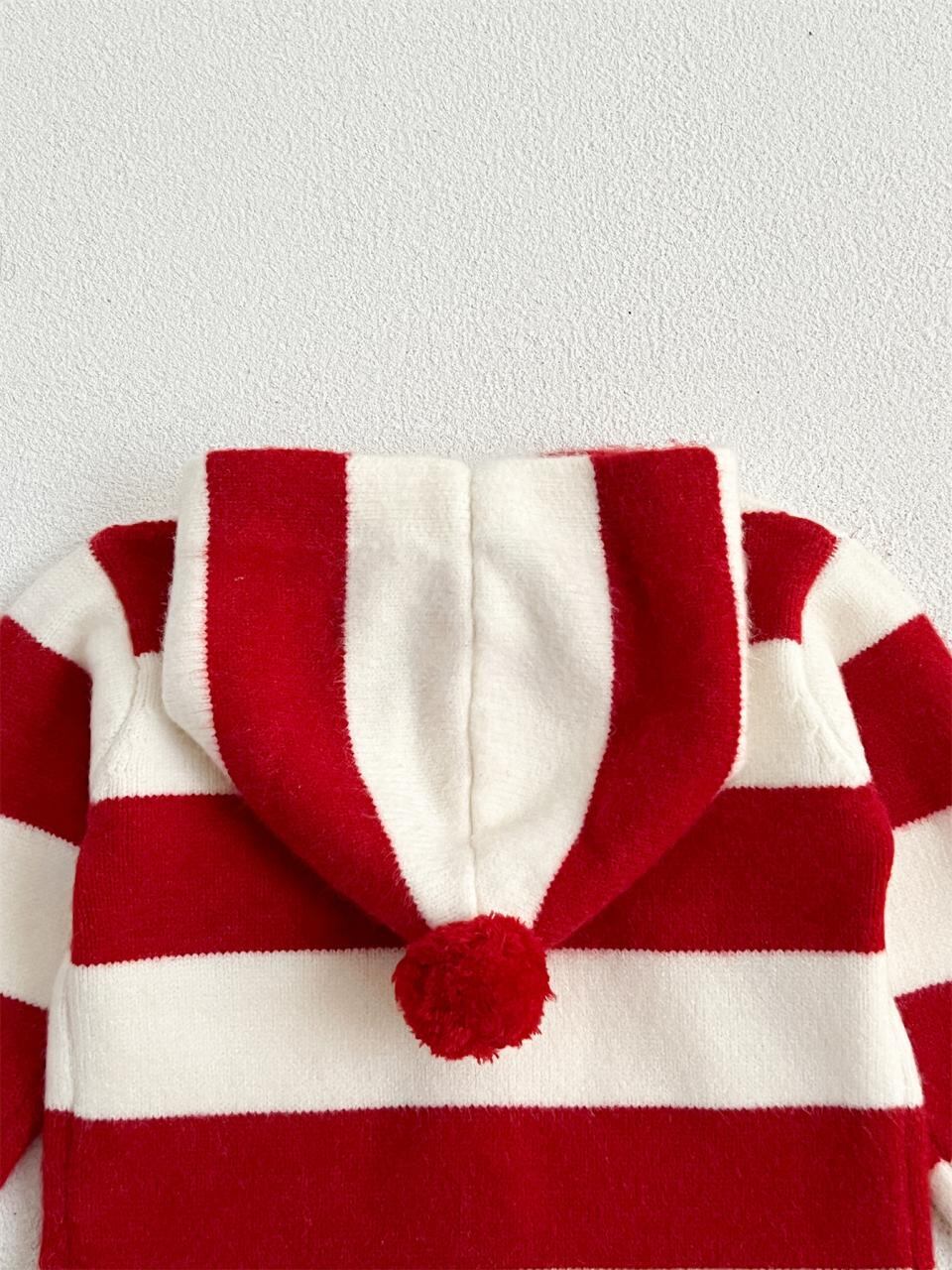 ベビー・キッズ ニットカーディガン 秋冬物 女の子 赤ちゃん用 レッド ストライプ柄 クリスマス風 フード付き セーター 長袖 コットン混紡 66cm 73cm 80cm 90cm 100cm 110cm 120cm かわいい 普段使い