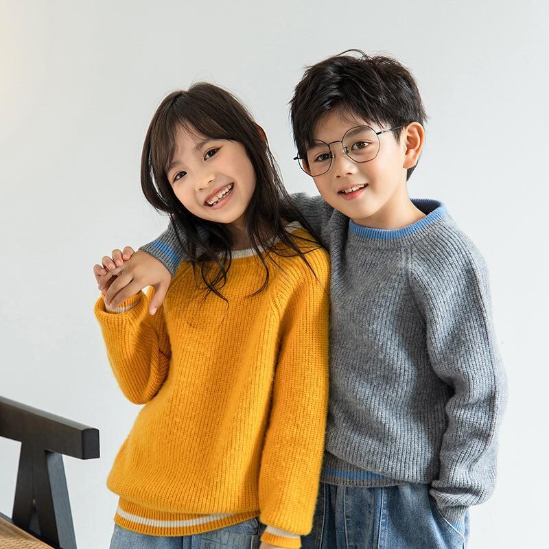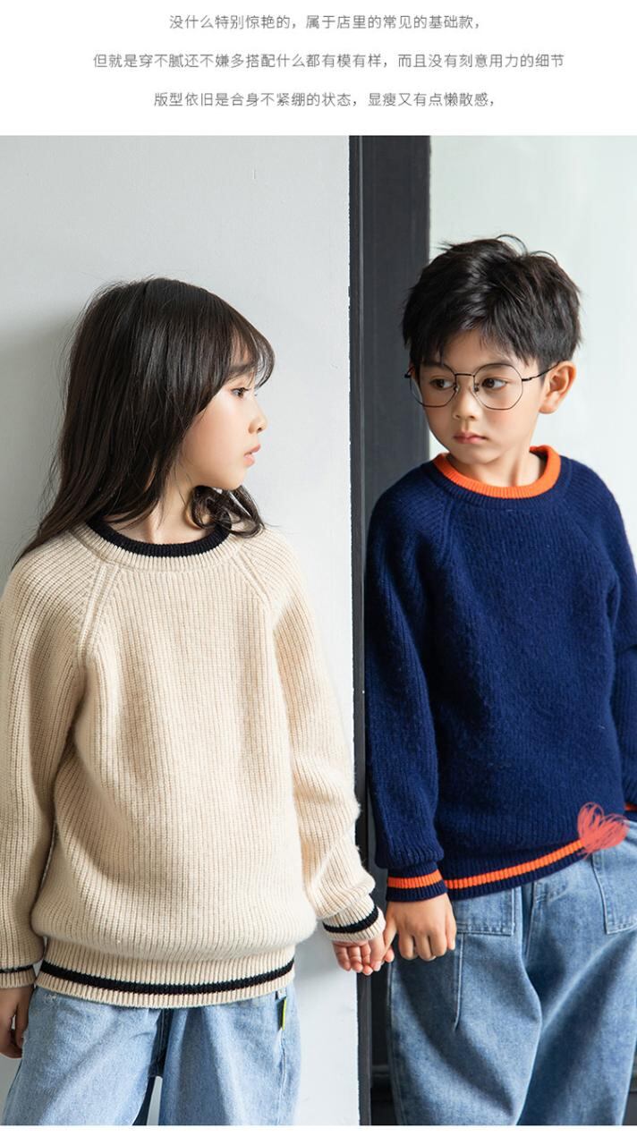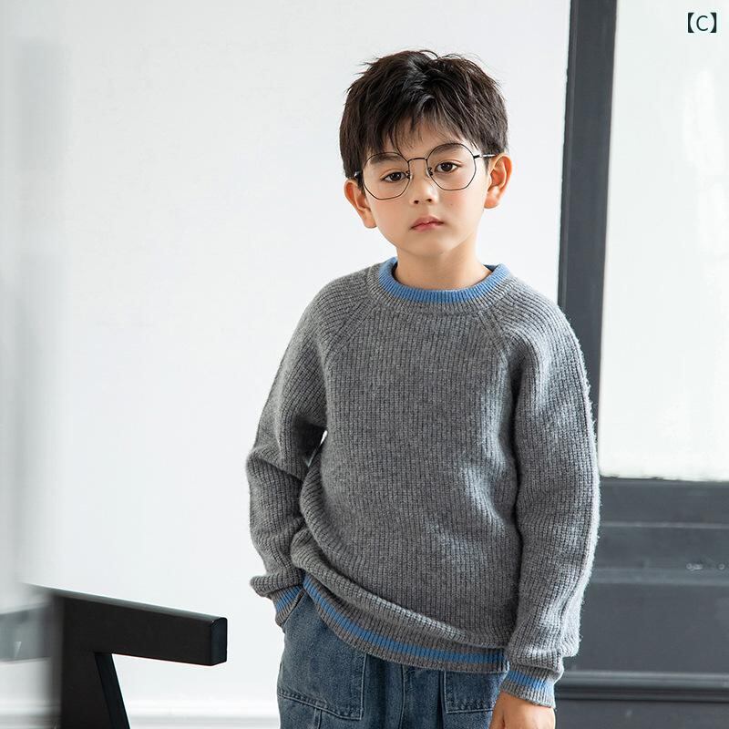 子供服 セーター 秋冬 ピュアウール クルーネック 男の子 女の子 中大童 配色 厚手 ニット トップス 防寒 100% 羊毛