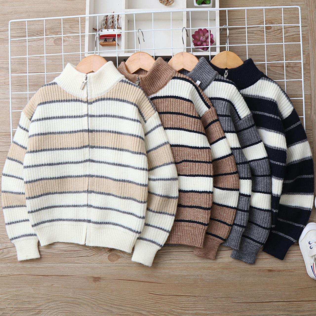子供服 ニット カーディガン 男の子 中童 大童 ウール 秋冬 ストライプ 厚手 立襟 長袖 アウター 白 コーヒー色 グレー 紺色