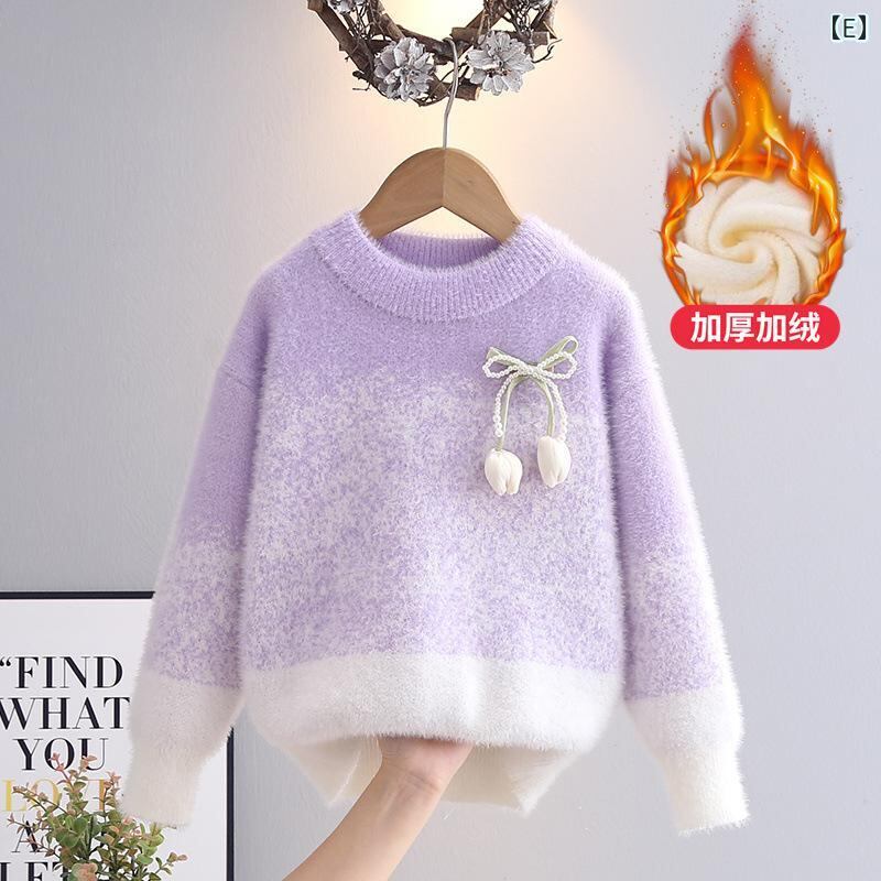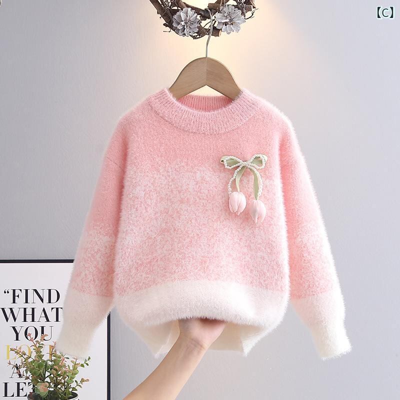 子供服 ニット セーター 女の子 秋冬 グラデーション イエロー チューリップ柄 トップス カットソー かわいい 暖かい 裏起毛 韓国絨 普段着