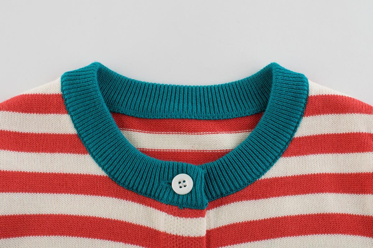 子供服 ニット・セーター 女の子 ストライプ柄 ニットカーディガン 長袖 コットン100% 秋冬 赤 白 普段使い 通園 通学