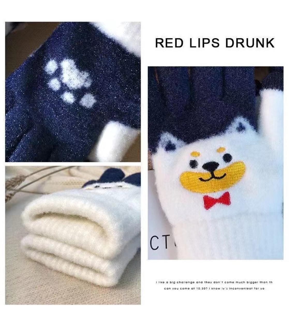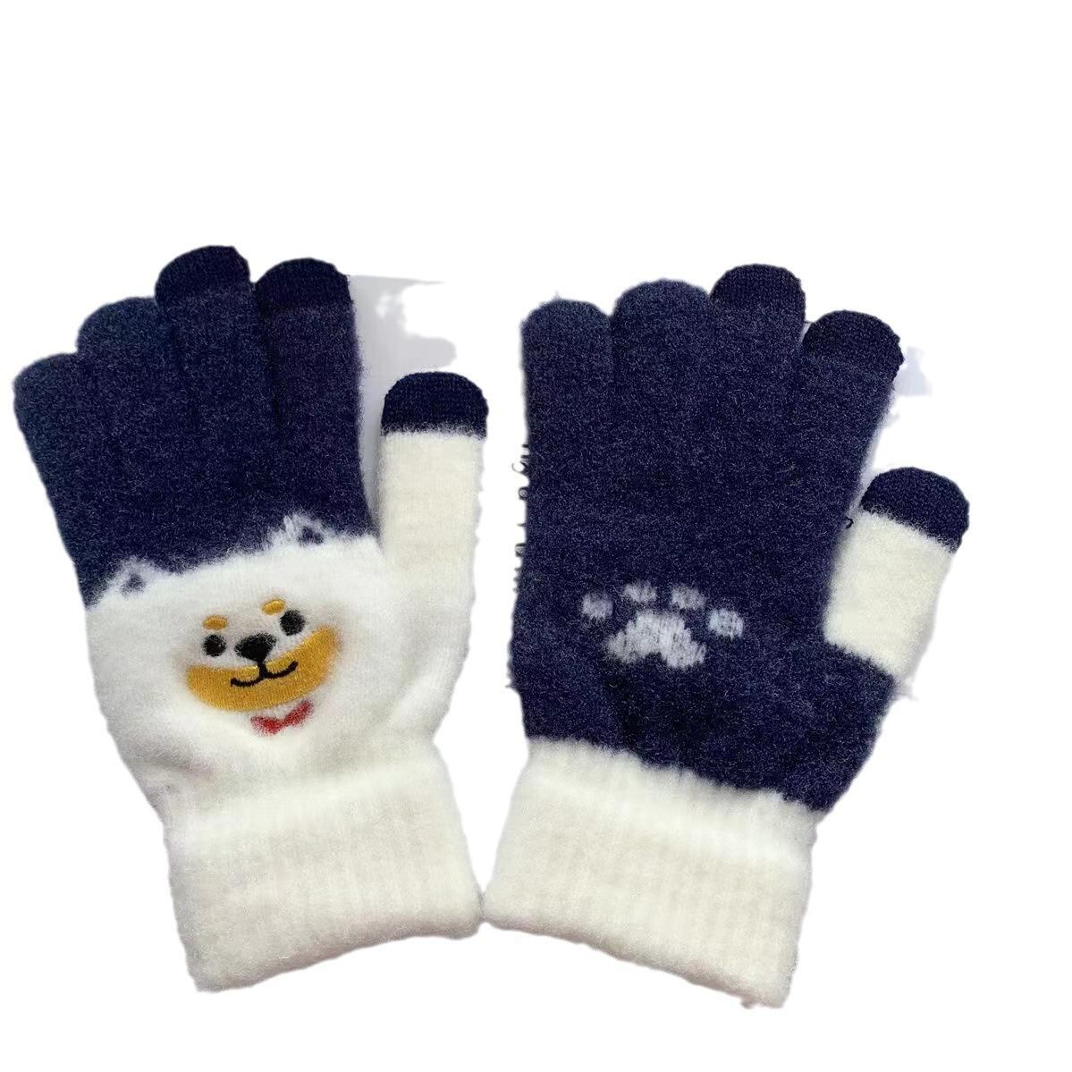 手袋 キッズ ニット手袋 かわいい 犬 刺繍 秋冬 暖かい 防寒 ぬいぐるみ スマートフォン対応 紺色 黄色 緑 アクリル ファッション小物
